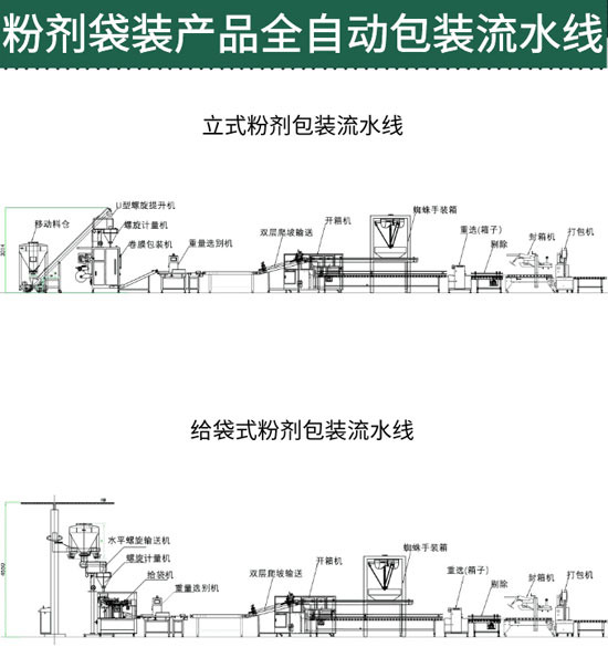 先來看一套粉劑的袋裝包裝生產(chǎn)線方案,主機(jī)分為給袋式粉劑包裝機(jī)和立式自制袋包裝機(jī)