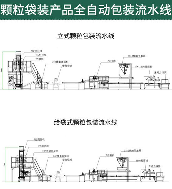 最后給大家提供兩套顆粒袋裝包裝生產(chǎn)線。顆粒袋裝包裝可包裝:堅(jiān)果、燕麥、肥料、種子、中藥飲片、枸杞、雜糧等中藥材顆粒等。