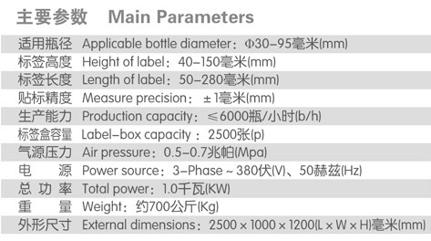 適用于圓形玻璃瓶、塑料瓶、聚酯瓶的連續(xù)紙標簽粘貼。貼標性能穩(wěn)定、換標操作簡單。